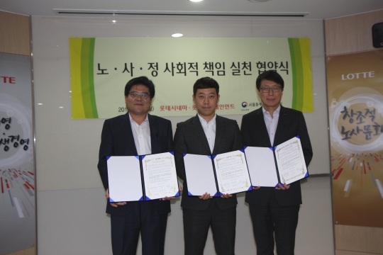 (왼쪽부터) 김연식 고용노동부 서울동부지청장, 김한솔 한마음협의회 근로자대표, 차원천 롯데시네마 대표가 노사정 협약 체결 후 기념사진을 찍고 있다. / 롯데시네마