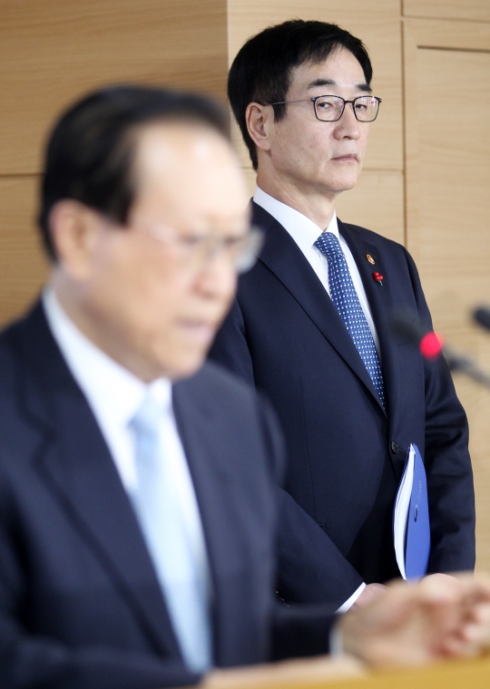 이준식 사회부총리 겸 교육부 장관이 28일 서울 종로구 정부서울청사에서 열린 국정교과서 현장검토본 공개 브리핑에 참석해 모두발언중인 김정배 국사편찬위원장을 바라보고 있다.