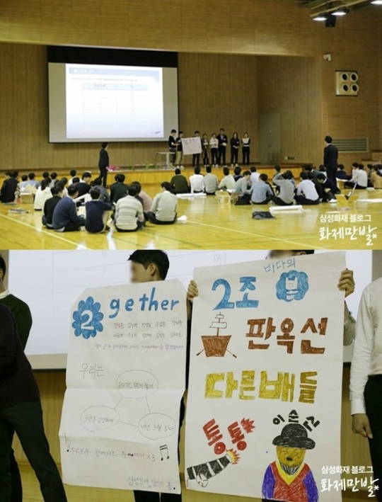 (위 사진)인성면접 후 대강당에 모인 지원자들이 삼삼오오 모여 앉아 팀 면접을 준비하고 있다. 주어진 문제를 함께 협동하며 어떻게 해결하는 지가 주로 평가된다. (아래 사진)지원자들은 자신의 조를 돋보이게 하기 위해 유행어를 사용하거나 노래로 발표하는 등 차별화를 뒀다./삼성화재