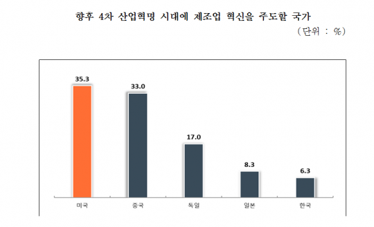 향후 4차 산업혁명 시대에 제조업 혁신을 주도할 국가로는 미국이 35.3%로 가장 많았고, 중국(33%)이 그 뒤를 이었다. 독일(17%)과 일본(8.3%)도 상대적으로 많았다. 하지만 우리나라가 주도할 것이라는 응답은 고작 6.3%에 그쳤다.