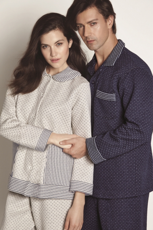 두께가 두터운 삼중직 원단의 파자마도 선보였다. 원단 사이에 솜을 추가한 도톰한 삼중직 원단을 사용했으며, 피부에 닿는 촉감이 포근해 더욱 따뜻한 느낌으로 착용할 수 있다. 심플한 도트와 스트라이프 매치로 넓은 연령대가 입을 수 있는 깔끔한 디자인으로 구성되어 있다. 숙면을 위한 안대도 세트에 함께 구성되어 있어 일석이조다.