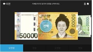 권종별 위조방지장치를 소개하고 비추어 보기, 기울여 보기, 만져 보기 등을 통한 위조지폐 식별요령을 안내한다./한은