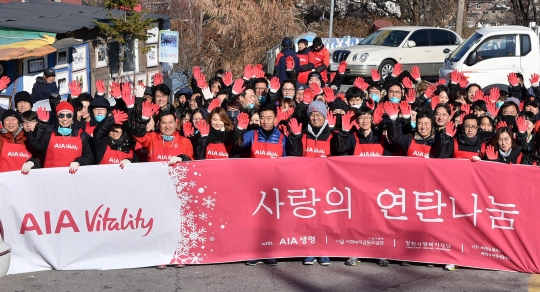 AIA생명은 지난 16일 서울 성북구 북정마을 일원에서 한파에 시달리는 저소득층 가정의 월동준비 지원을 위한 '사랑의 연탄나눔' 봉사활동을 가졌다./AIA생명
