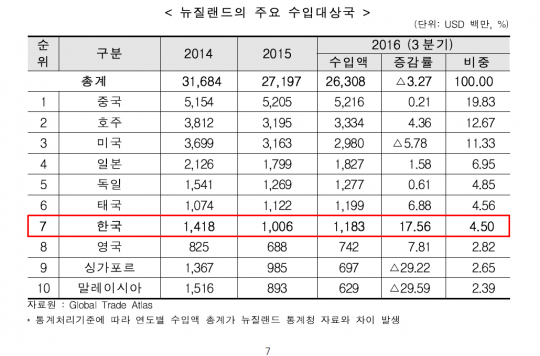 올해 3분기 뉴질랜드 총수입은 3% 감소했지만, 한국은 10대 수입국 중 유일하게 두 자릿수 증가율(17.6%)을 보이며 7위를 기록했다.