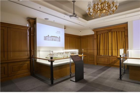 화폐박물관 건축실 내부 전경. 옛 지도를 바탕으로 한국은행이 위치한 남대문로의 옛 모습을 모형과 영상으로 재현하여 우리나라 금융의 역사를 건축물을 통해 알 수 있도록 구성했다. 국가중요문화재(사적 제280호)인 화폐박물관의 역사적 가치를 모형과 영상을 통해 재조명했다./한은