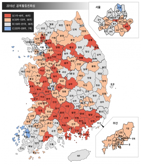 기업 하기 좋은 환경을 나타내는 경제활동친화성을 살펴보면 우수등급인 S·A등급 지자체가 작년 110곳에서 올해는 135곳으로 증가했다.