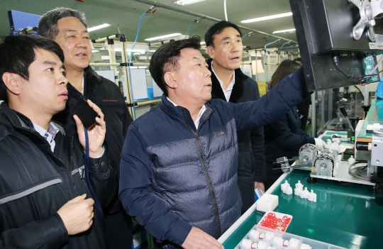 이노비즈협회 이규대 회장과 중소기업중앙회 박성택 회장(왼쪽 두번째부터)이 3일 인천 도화동 이랜시스를 방문, 스마트공장내 시스템을 둘러보고 있다. /중기중앙회