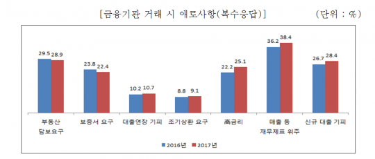 금융기관과 거래할 때 가장 큰 애로사항은 '매출액 등 재무제표 위주 대출관행'(38.4%)이었다. 이외에 '부동산 담보요구'(28.9%), '신규대출 기피'(28.4%), '고금리(25.1%)' 등도 여전했다.