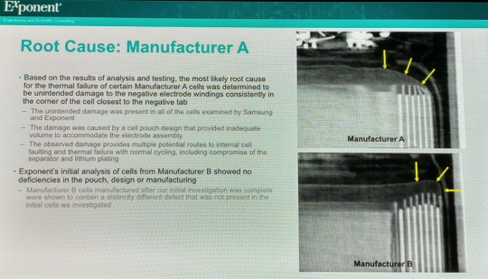 중국 ATL이 공급한 배터리에서는 비정상적인 융착돌기가 발견됐다. 양극판에 접지부인 양극탭을 붙이는 과정에서 '울트라소닉 웰딩' 기술을 사용했는데 이 과정에서 일부 구리가 녹으며 원뿔 형태로 올라왔고 이 뿔들이 분리막을 찢었다는 설명이다. 일부 제품에서는 절연테이프가 부착되지 않는 등 품질관리(QC)에도 문제가 있던 것으로 드러났다.