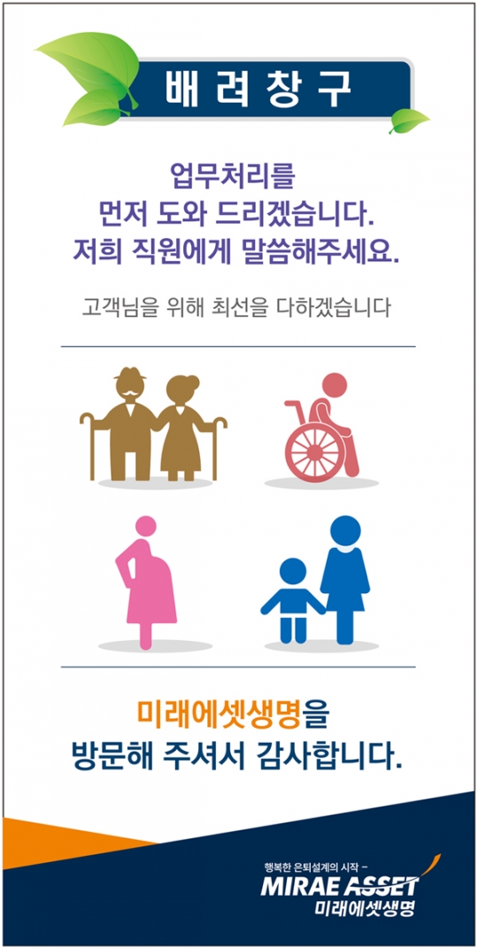 미래에셋생명의 노인·장애인·임산부 배려창구 운영 창구 팻말./미래에셋생명