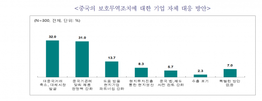 중국의 보호무역조치에 대한 중소기업 자체 대응 방안에 대해선 '중국 거래를 축소하고 대체 시장을 발굴하겠다'(32.0%)와 '중국 기준에 맞춰 제품 경쟁력을 강화시키겠다'(31.0%)가 주를 이뤘다. 이외엔 '도움받을 현지기업의 파트너십을 강화'(13.7%) '현지투자 진출을 통한 현지 생산'(8.3%), '중국 법, 제도 사전검토 강화'(5.7%) 등의 순이었다.