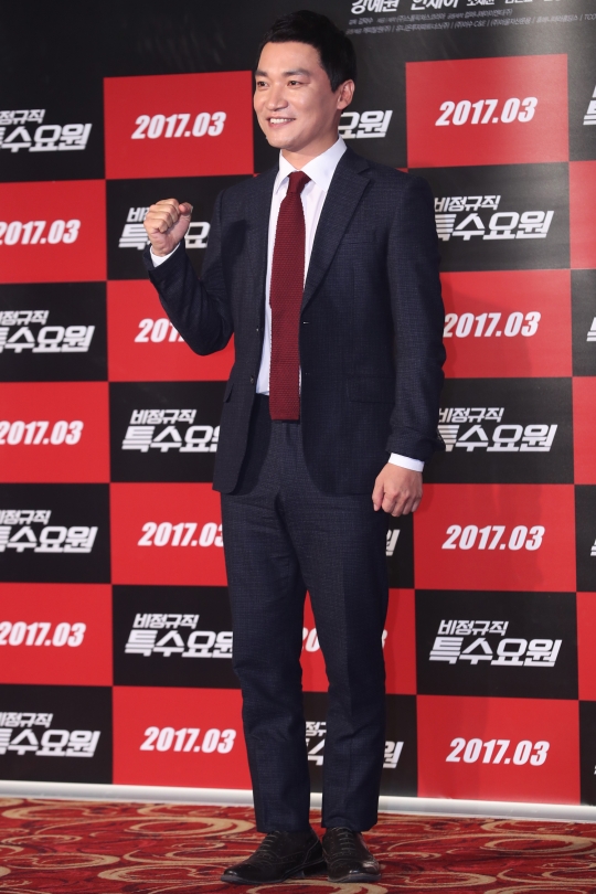 배우 조재윤이 13일 오전 서울 광진구 롯데시네마 건대입구점에서 열린 영화 '비정규직 특수요원' 제작보고회에 참석해 포토타임에 포즈 취하고 있다.