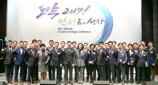 지난달 10일 서울 웨스틴조선호텔 그랜드볼룸에서 열린 2017 메트라이프생명 영업전략회의에서 메트라이프생명 사업단장과 임직원들이 힘찬 출발을 알리는 구호와 함께 화이팅을 외치고 있다./메트라이프생명