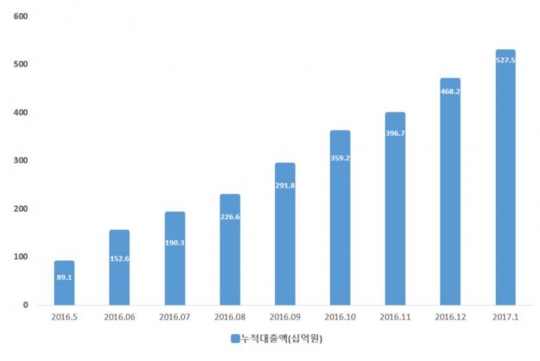 한국P2P금융협회 34개 회원사의 월별 누적대출액 추이./P2P금융협회
