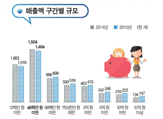 2015년 조사 기준으로 연 매출이 1200만원 미만인 비율은 21.2%, 1200만원 이상~4600만원 미만은 30.6%로 각각 나타났다. 소상공인 둘 중 하나는 연간 매출이 5000만원에 미치지 못한다는 것이다. 이는 순수익이 아니라는 점에서 더욱 심각하다.