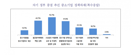 중기중앙회가 지난 1월 중소기업, 소상공인 100곳을 대상으로 조사한 자료에 따르면 '차기 정부 경제정책 방향'으로 '내수 경기 회복'을 주문한 비율(복수응답)은 61.3%로 1위였다. 중점 추진할 중소기업 정책으로는 '소상공인 사업영역 보호 및 자생력·경쟁력 강화'가 52.7%로 가장 많았다.