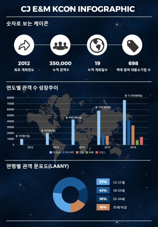 CJ E&M은 오는 3월 17일과 18일 양일간 멕시코시티에서 열리는 'KCON 2017 Mexico'를 시작으로 5월 일본, 6월 뉴욕, 8월 LA, 9월 호주까지 케이콘을 확대해 전세계 K라이프스타일 영토 확장에 앞장선다.