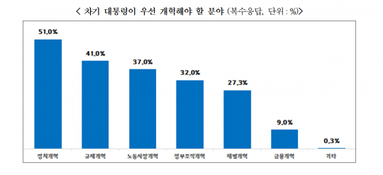 또 차기 대통령이 취임 후 우선적으로 개혁해야 할 분야도 절반 이상인 51%가 '정치개혁'을 꼽았다. 이외에 '규제개혁'(41%), '노동시장개혁'(37%)도 중요한 개혁분야에 포함됐다.