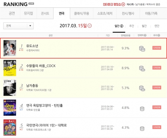 연극 '유도소년'에 대한 호평이 쏟아지고 있는 가운데, 15일 진행된 2차 티켓 오픈에서 당당히 랭킹 1위에 등극하는 등 '대학로 흥행깡패'의 저력을 다시 한 번 입증했다.