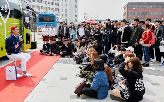 광운대에서 열린 2017년 찾아가는 청년버스 출정식에서 인기개그맨 김영철씨가 자신의 경험을 바탕으로 청년들에게 자존감과 용기를 키울 수 있는 토크버스킹을 진행하고 있다./광운대
