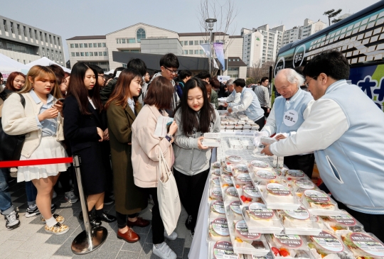 광운대에서 열린 2017년 찾아가는 청년버스 출정식에서 광운대 천장호 총장 등이 학생들에게 응원도시락을 나누어주고 있다./광운대