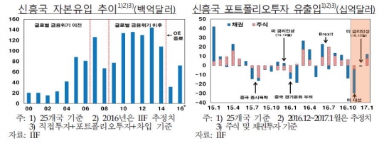 신흥국 자본유입 추이 및 포트폴리오투자 유출입./한은, IIF 등