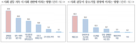 사회 갈등 심화가 중소기업 경영에 미치는 영향으로는 '매출감소'(42.3%), '설비투자 및 신규사업진출 포기'(33.7%), '신규 채용 위축'(12.3%) 등의 순이었다. 사회 갈등 증폭→기업 경영 부정적 영향→기업 성장 저해→경기 침체 등의 악순환이 이어진다는 것이다.