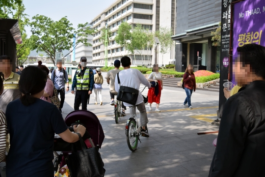 하지만 관련 규정에도 불구 3일 광화문 인근에서 따릉이를 이용하는 시민들을 살펴보니 10명 중 9명은 인도를 통해 자전거를 운행하고 있었다. 번잡한 시간대에 보행자와 부딪힐 뻔한 아찔한 상황도 목격됐다.