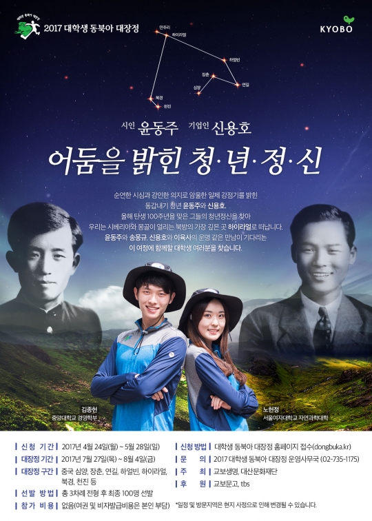 이번 대장정은 '어둠을 밝힌 청년시인 시인 윤동주, 기업인 신용호'라는 주제로 오는 7월 27일부터 8월 4일까지 8박 9일간 진행된다. 1917년생 동갑내기인 두 사람을 올해로 탄생 100주년을 맞이했다. 일제강점기 청년정신을 밝힌 인물로 평가된다. 참가학생들은 윤동주 시인이 태어나고 자란 중국 용정과 연길 일대를 탐방하며 윤동주 생가, 대성중학교, 명동성당 등을 살펴보게 된다. 또 신용호 창립자가 청년 시절을 보낸 북경, 하얼빈 일대를 탐방하고 하이라얼 초원을 트래킹한다.