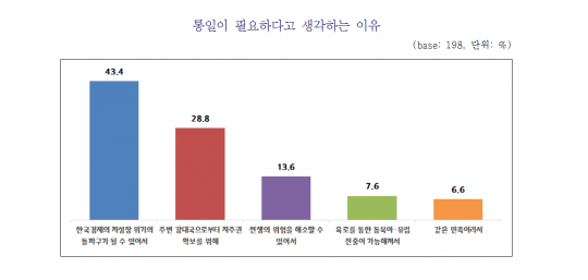 중소기업중앙회가 중소기업인 300명을 대상으로 '남북관계 및 통일에 대한 인식조사'를 실시해 14일 내놓은 결과에 따르면 통일은 '한국경제의 저성장위기의 돌파구가 될 수 있어서'(43.4%), '주변 강대국으로부터 자주권 확보를 위해서'(28.8%) 등의 이유로 꼭 필요하다고 응답했다.