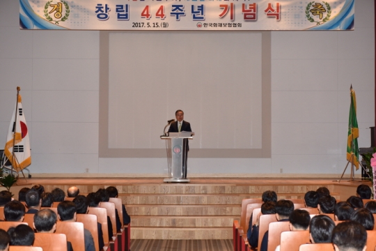 지대섭 이사장은 15일 창립 44주년 기념식에서 "안전점검을 비롯한 업무 전반에 생산성 향상의 지속 추진과 생산성 향상으로 확보한 시간·여력 등 기술력 고도화에 집중하는 노력이 필요하다"고 말했다./화재보험협회