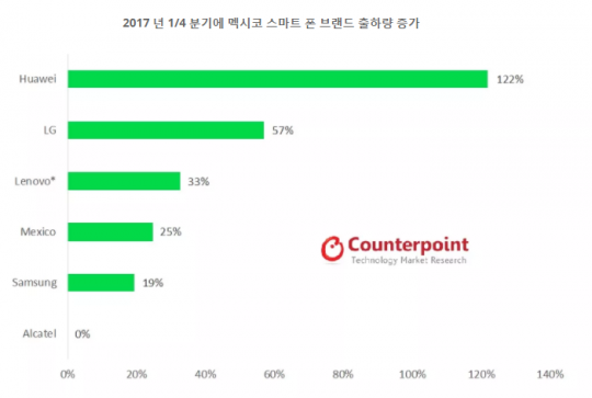 시장이 성장하며 수혜를 입은 브랜드는 LG전자와 중국 화웨이였다. 삼성전자에 이어 멕시코 시장 2위 브랜드인 LG전자의 점유율은 지난해 1분기 11%에서 올해 1분기 14%로 성장했다. 루 수석 컨설턴트는 "LG전자와 화웨이가 올해 1분기 삼성전자와 알카텔의 점유율을 빠르게 잠식했다. LG전자의 스마트폰 판매량은 지난해 1분기와 비교해 57% 증가했다"며 "특히 중형 LTE 스마트폰 수요 증가가 LG전자와 화웨이의 시장 점유율을 사상 최고 수준으로 끌어올리는 데 기여했다"고 말했다.
