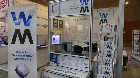 유리창 청소로봇 '윈도우메이트'가 전시장에 설치된 유리창을 청소하고 있다. /김승호 기자