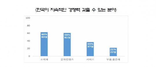 이런 가운데서도 한국 제품이 지속적으로 경쟁력을 갖출 수 있는 분야로는 소비재(60%), 문화컨텐츠(58%), 서비스(35%), 부품·중간재(21%) 순으로 꼽혔다.