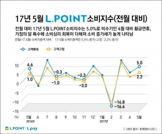 소비심리의 회복은 황금연휴 특수뿐 아니라 이른 더위로 인한 가전제품 수요 증가의 영향으로 분석된다고 롯데측은 설명했다. 전월 대비 5월 L.POINT소비지수도 5.0%(고정 2.2%)로 지속적인 회복세를 보였다.