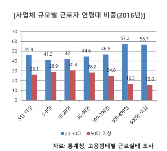 중소기업은 또 대기업에 비해 고령화 현상도 심각한 것으로 나타났다. 한 예로 종업원수가 10~29명인 중소기업의 경우 20~30대 청년층 비중은 42%, 50대 이상은 30.4%를 차지했다. 반면 500인 이상 대기업은 56.7%가 20~30대였고, 50대 이상은 15.6%로 대기업이 중소기업보다 대체로 젊었다. 특히 중소기업의 청년 인력 비중이 계속 줄고 있는 것이 가장 큰 문제다. 전체 고용의 약 88% 가량을 차지하는 중소기업은 고령화 현상으로 몸살을 앓고, 청년들은 일자리를 갖지 못하는 악순환이 계속되고 있는 것이다.
