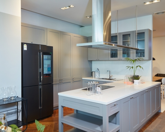 한화L&C 큐치네 브랜드의 주방 상판에는 인조대리석보다 탁월한 엔지니어드 스톤인 '칸스톤'과 인조대리석 '하넥스'를 적용했다. 특히 칸스톤은 석영을 원료로 해 주방 상판이 가져야 할 여러 장점을 두루 갖췄다는 평가다.