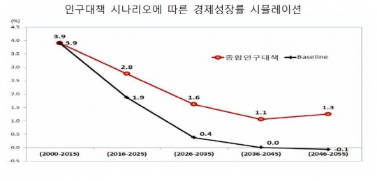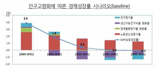 분석 결과 인구고령화에 따른 우리나라 경제성장률은 지난 2000~2015년 중 연평균 3.9%에서 2016~2025년 중 1.9%, 2026~2035년 중 0.4%까지 하락할 것으로 추정됐다.