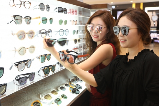 롯데백화점을 방문한 소비자들이 오이일 선글라스 상품을 착용하고 있다. /롯데백화점