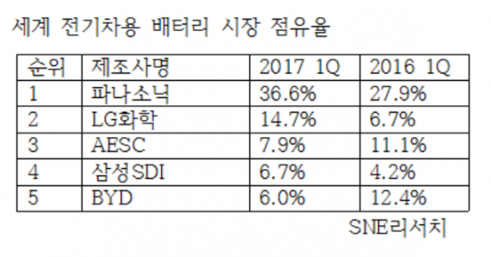 지난 1분기 세계 전기차용 배터리 시장 점유율은 파나소닉, LG화학, AESC, 삼성SDI, BYD 순이었다. /SNE리서치