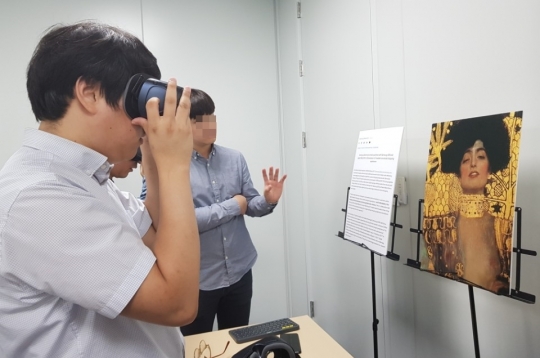 기어vr을 착용하고 릴루미노를 체험하는 모습. 릴루미노는 최대 8배율 확대 기능을 제공한다. /오세성 기자