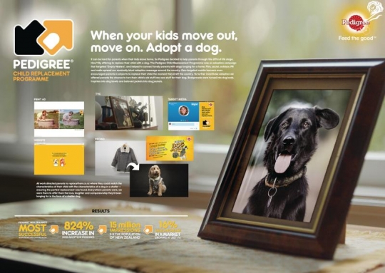 뉴질랜드의 콜렌소 BBDO가 제작한 페디그리사의 '자식의 빈자리를 채워주는 유기견'은 성인이 된 자식이 집을 떠나 '빈 둥지 증후군'을 겪는 부모에게 자식의 성격을 닮은 유기견을 입양 해주는 내용을 담고 있다.