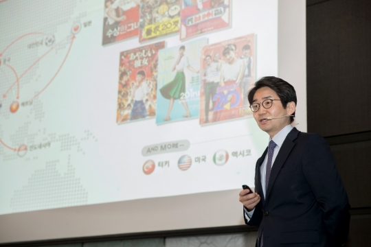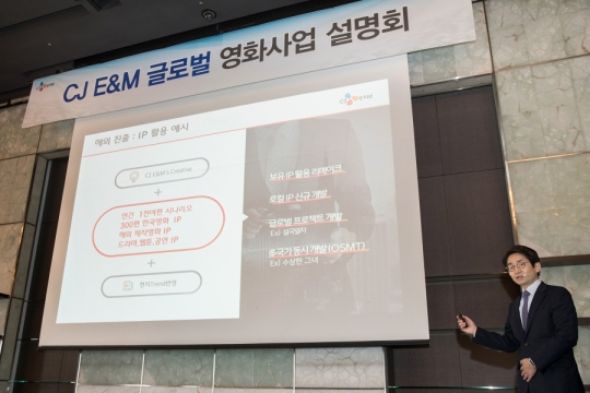 임명균 CJ E&M 영화사업부문 해외사업본부장이 글로벌 영화사업 설명회에서 프레젠테이션을 하고 있다./CJ E&M