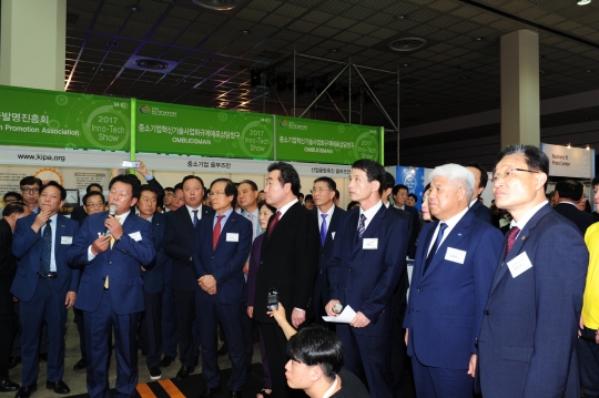 이낙연 국무총리(오른쪽 네번째)가 2017년 중소기업 기술혁신대전 전시장을 관람하며 설명을 듣고 있다./중기부