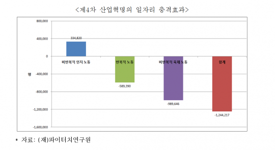 이런가운데 재단법인 파이터치연구원은 '과학적 접근을 통한 제4차 산업혁명의 일자리 충격효과 도출' 보고서를 통해 4차 산업혁명에 의해 향후 20년간 부품조립자 등과 같은 반복적 노동자는 58만9390명, 음식점 종업원 등 비반복적 육체 노동자는 98만9646명이 각각 감소한다고 분석했다. 대신 소프트웨어 설계자 등과 같은 인지노동자는 이 기간 33만4820명 증가할 것으로 내다봤다.