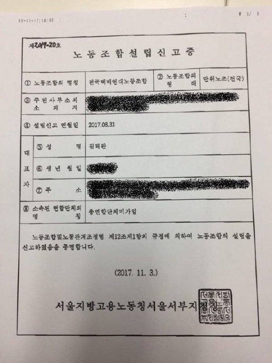 3일 고용부로부터 발급 받은 설립신고필증/택배노동조합