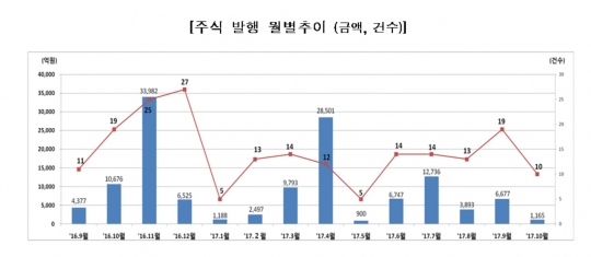 28일 금융감독원에 따르면 10월 중 공모를 통한 기업의 주식·회사채 발행실적은 총 10조 7699억원으로 전월 대비 30.6% 줄었다.