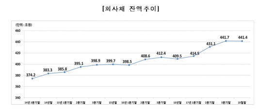 10월 말 기준 회사채 미상환 잔액은 441조3541억원으로 전월 대비 0.1% 감소했다.