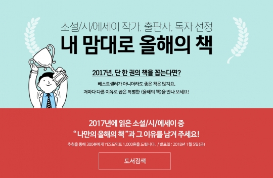 예스24는 이번에 실시한 설문조사를 토대로 문학작가와 출판사가 선정한 '올해의 책'과 다른 출판사가 탐나는 책, 문학 MD가 뽑은 '내 맘대로 올해의 책'을 소개하는 기획전을 열고, 오는 1월 5일까지 독자들이 2017년에 읽은 시·소설·에세이 중 '나만의 올해의 책'을 추천 이유와 함께 남기면 추첨을 통해 총 300명에게 YES포인트 1000원을 증정하는 '내 맘대로 올해의 책' 이벤트를 실시한다.