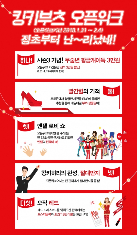 또한 이색 이벤트로 72초 동안 볼 수 있는 '킹키부츠 엔젤 로비 쇼', 커튼콜을 더욱 신나게 하는 '춤추는 절대반지 예매자 전원 증정', 레드 드레스코드 관람자 대상 '2018 킹키부츠 포스터 달력과 'JUST BE! WHO YOU WANNA BE' 메시지 리본을 증정'하며 공연장 분위기를 한 층 뜨겁게 북돋을 예정이다.